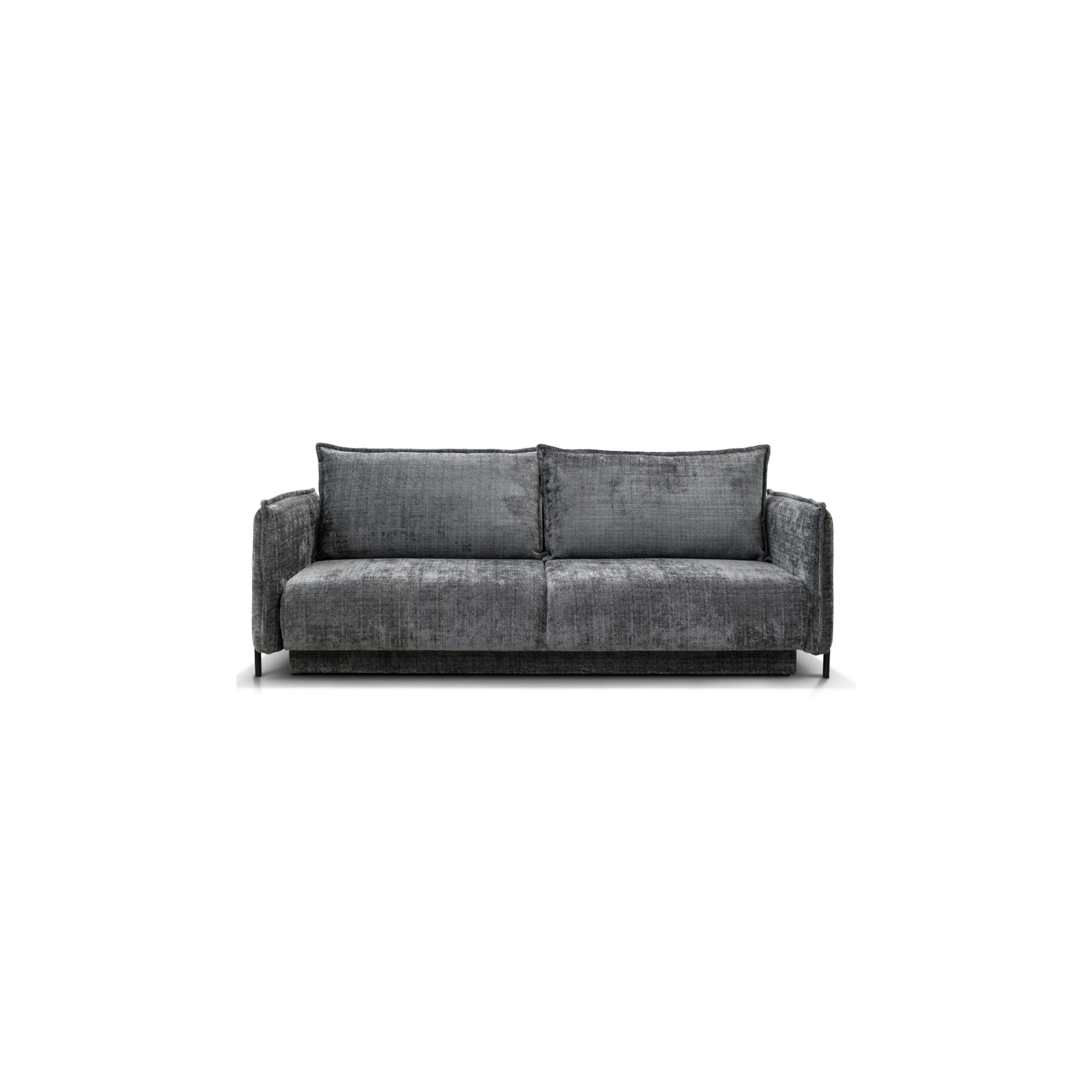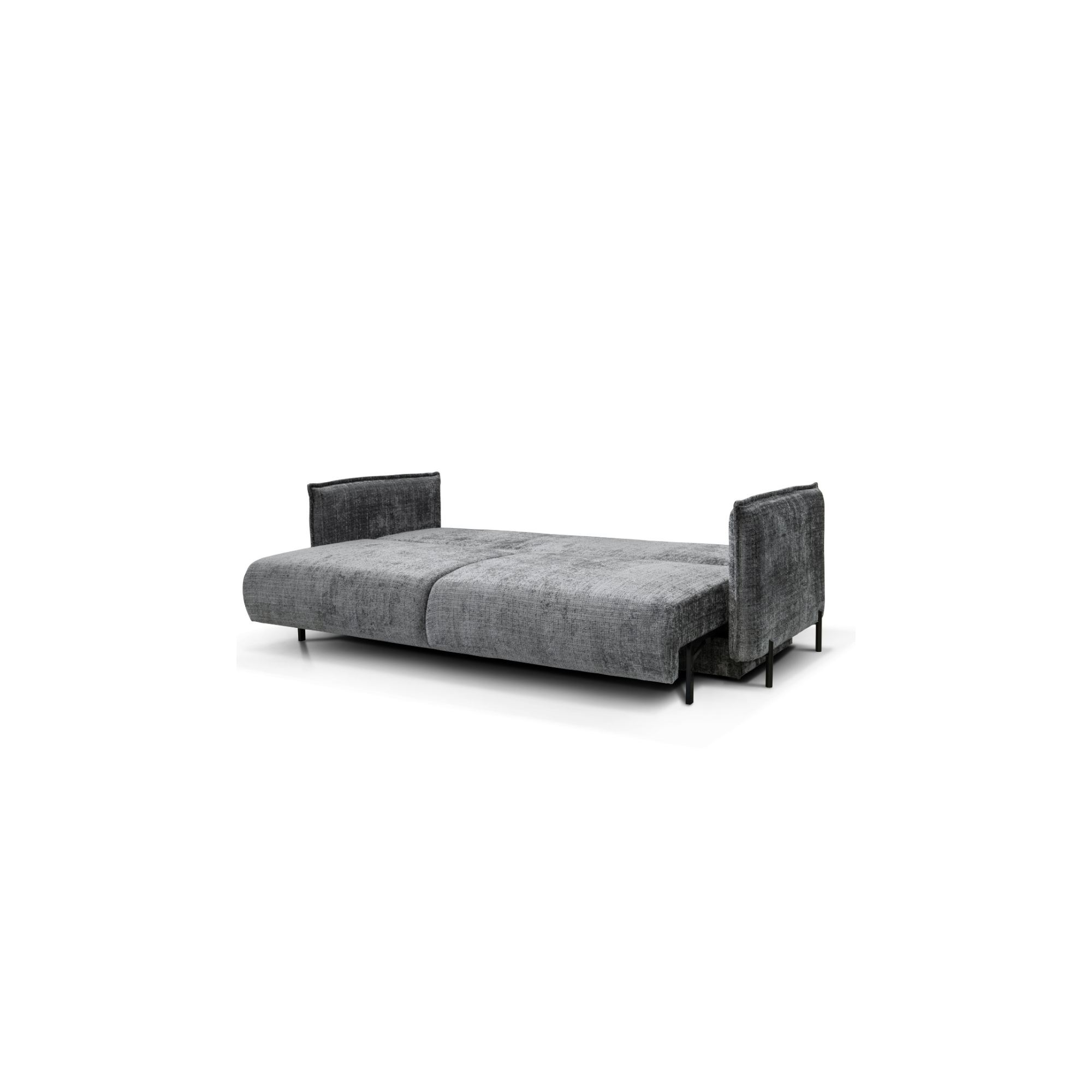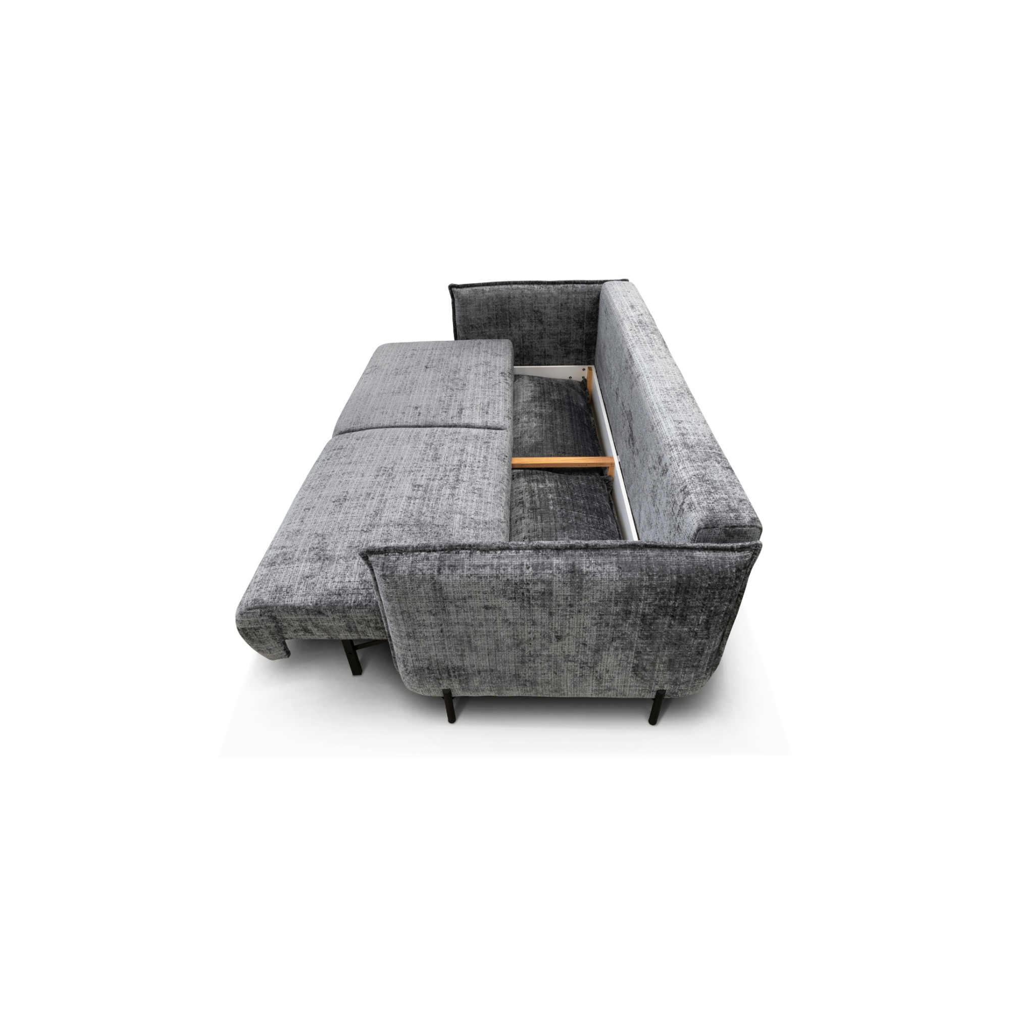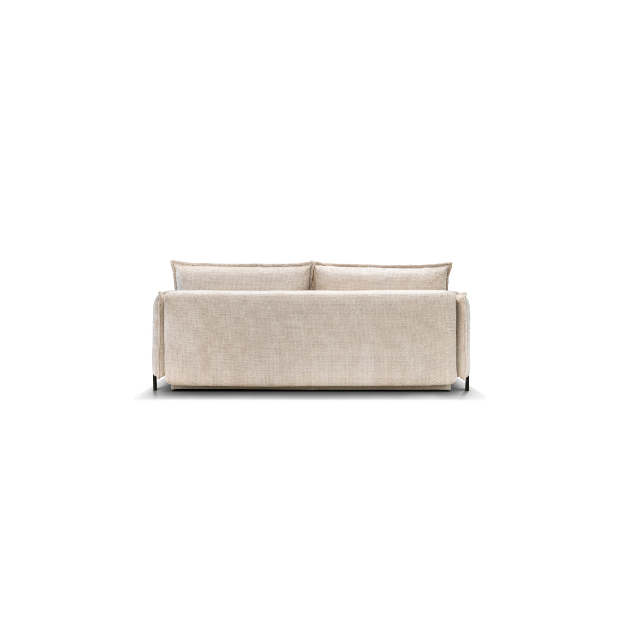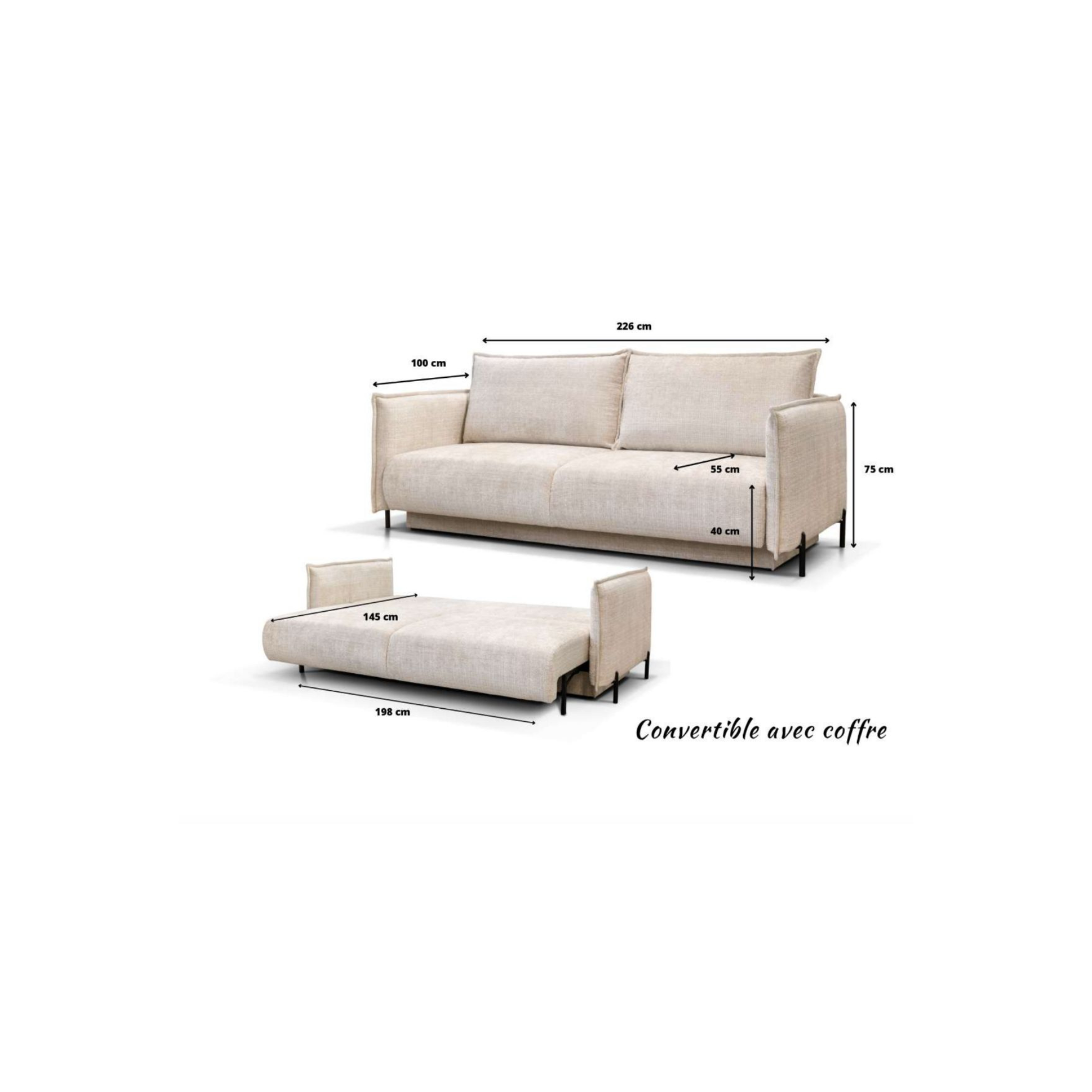 Fauteuil au design épuré avec assise généreuse et tissu texturé beige, reposant sur des pieds fins en métal noir. Parfait pour un intérieur moderne et chaleureux.
