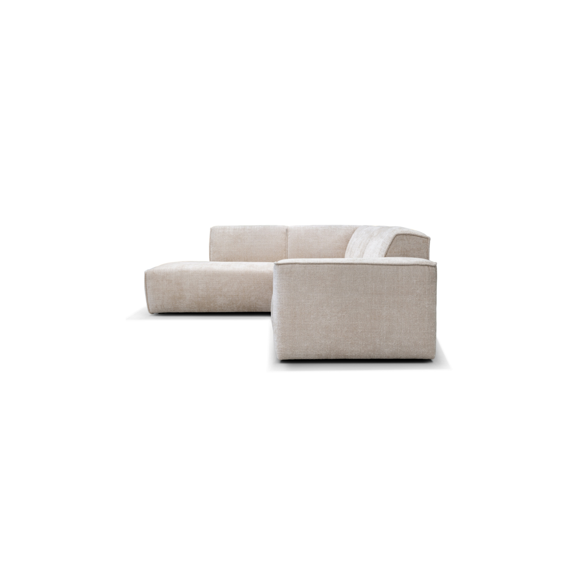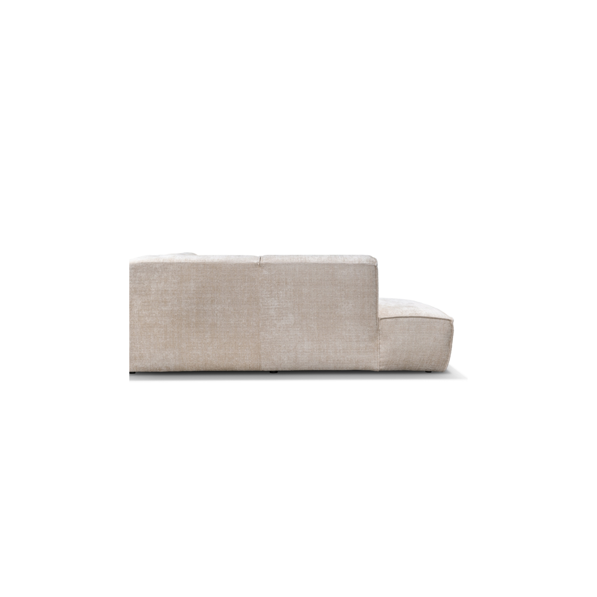Fauteuil au design épuré avec assise généreuse et tissu texturé beige, reposant sur des pieds fins en métal noir. Parfait pour un intérieur moderne et chaleureux.