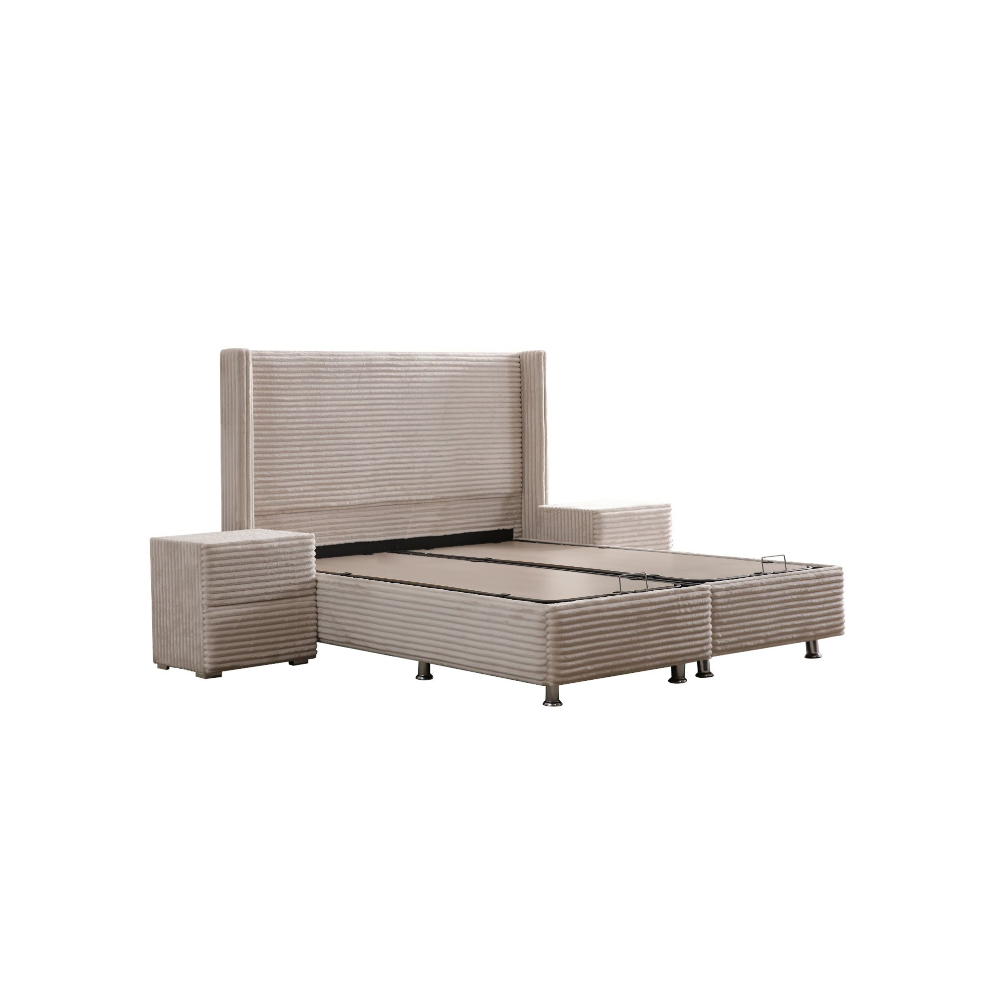 Fauteuil au design épuré avec assise généreuse et tissu texturé beige, reposant sur des pieds fins en métal noir. Parfait pour un intérieur moderne et chaleureux.