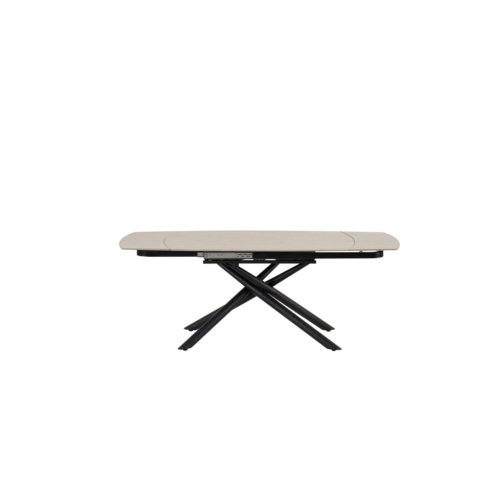 Fauteuil au design épuré avec assise généreuse et tissu texturé beige, reposant sur des pieds fins en métal noir. Parfait pour un intérieur moderne et chaleureux.